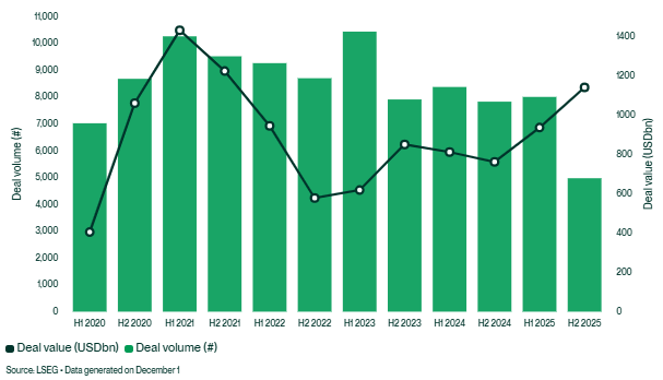 North American M&A activity mirrored the prevailing global trend in 2025, with an uptick in deal value in the second half of the year to USD1.1 trillion despite M&A volumes falling.