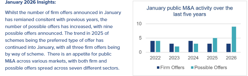 In January 2026, there were three Rule 2.7 announcements made across the UK public M&A market and nine further possible offers announced.