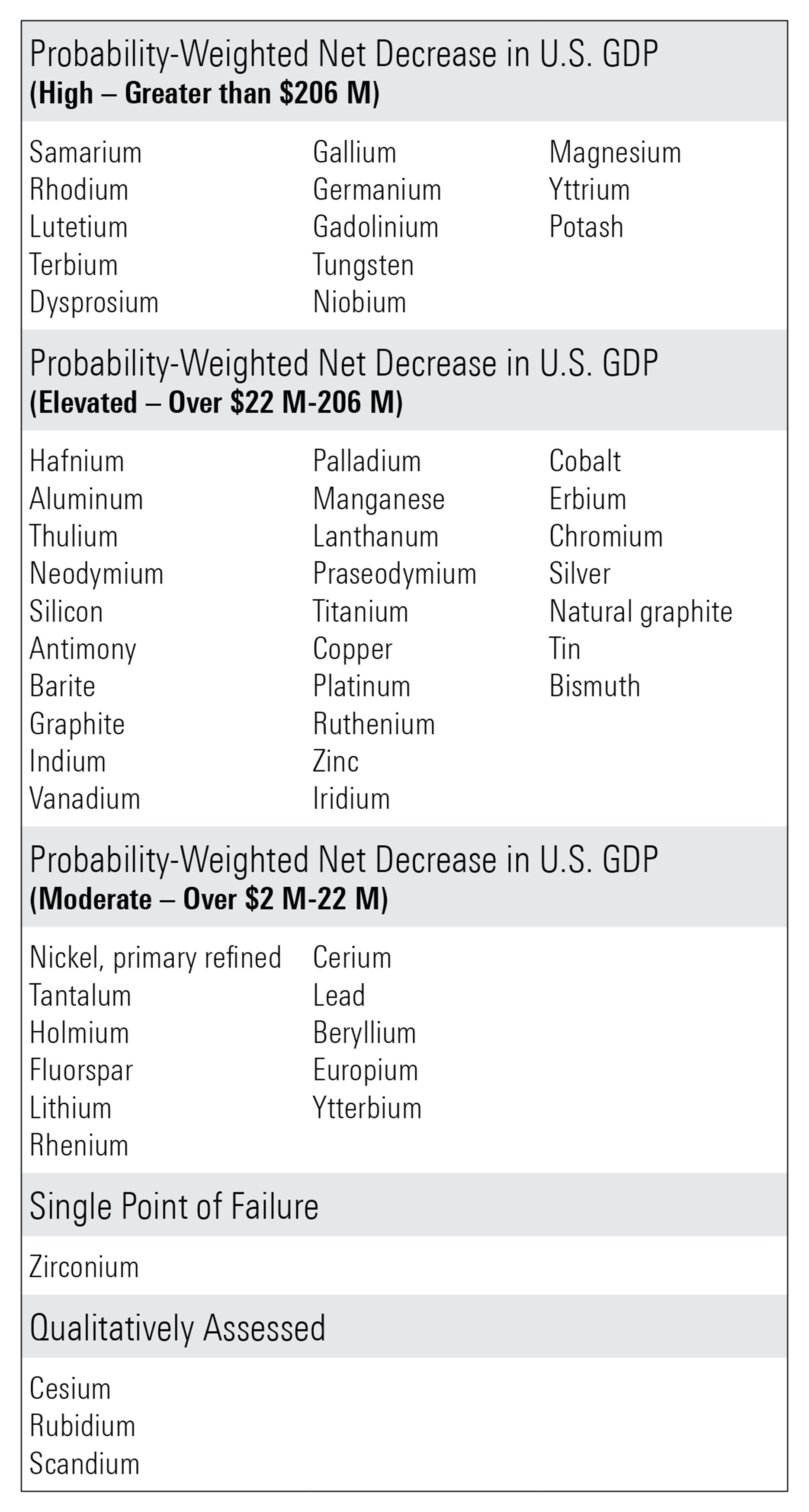- an economic effects assessment quantifying the effects of trade disruptions on the U.S. economy as measured by changes to U.S. Gross Domestic Product (GDP). The trade disruption scenarios account for the probability of each scenario’s occurrence. For example, the probability of an export restriction is 100% for scenarios involving China’s trade disruptions of minerals that China has to date targeted for export restrictions or bans while that figure was lower for other minerals China has not to date targeted and for scenarios involving trade disruptions from other countries. The results are presented in terms of changes to U.S. GDP by individual industry (based on an estimate of consumption of the mineral in that industry) and the economy. Minerals with probability-weight net decreases of over $2 million in U.S. GDP on an annual basis are included in the Critical Minerals List. If this threshold is not met with respect to a particular mineral, that mineral is assessed under the second criterion.