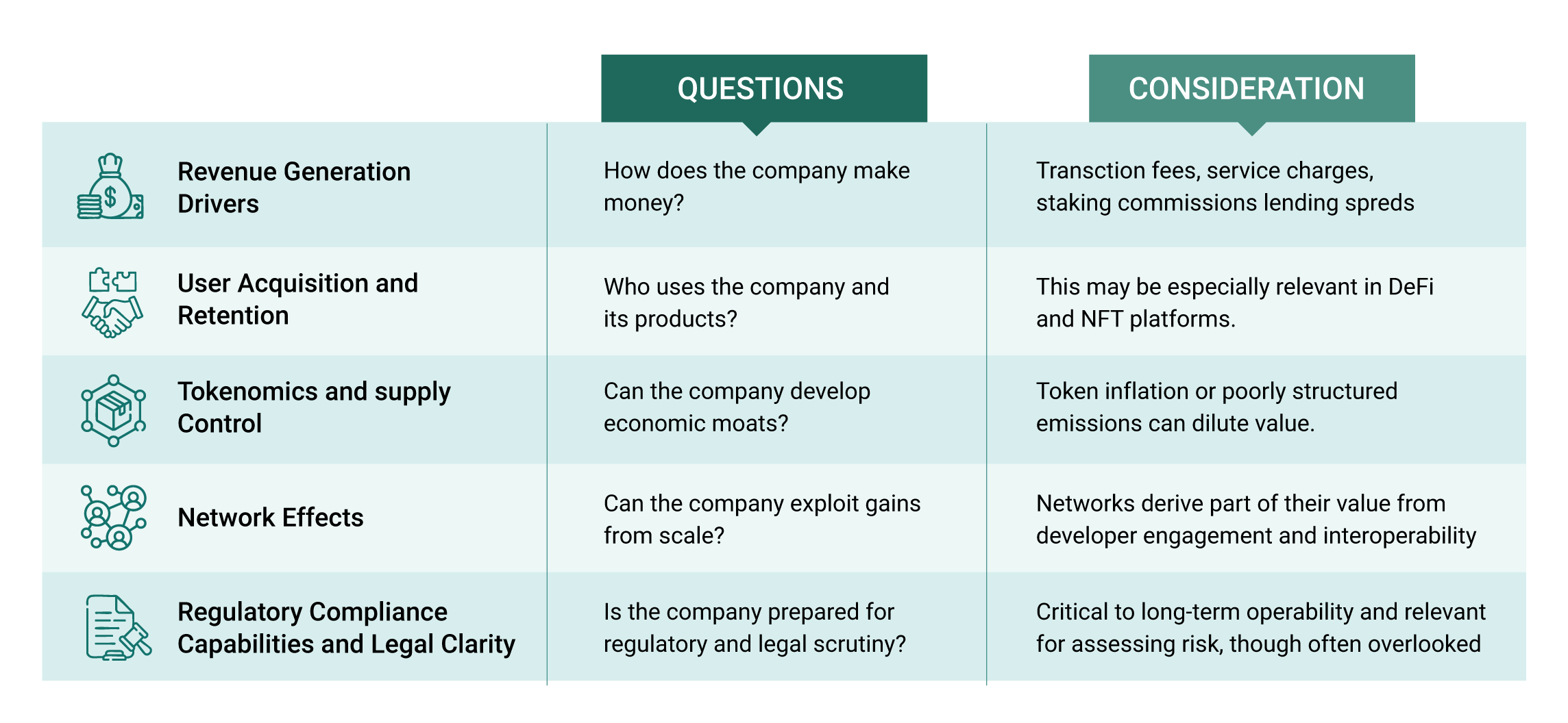 So what does a defensible business valuation entail? Of course, each business is subject to different specific facts and circumstances. However, what is universal is the need for the valuation to properly demonstrate a keen understanding of the underlying business of the subject company, including its key mechanisms to create and retain value. For example, for digital assets companies, such as crypto exchanges, one might evaluate the questions and considerations posed in the table below.