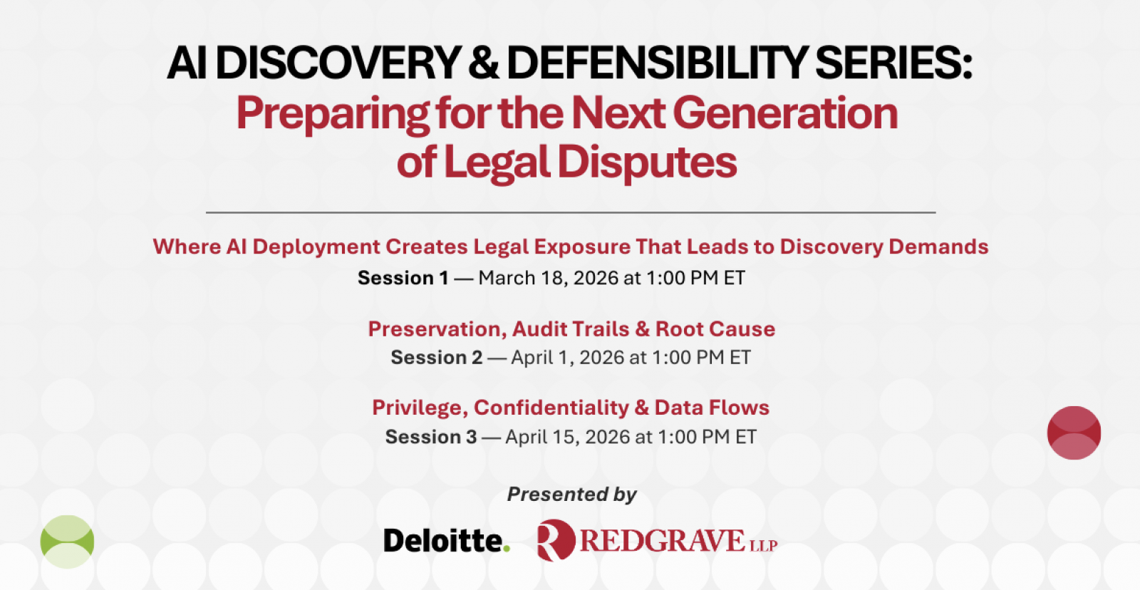 Redgrave LLP, in partnership with Deloitte, will lead a three-part AI Discovery & Defensibility Series: Preparing for the Next Generation of Legal Disputes offering a practical, litigation-informed perspective on how to anticipate these challenges, understand where AI creates real risk, and build the defensibility needed to comply with new legal discovery demands emerging in disputes and investigations in the AI era to ensure that organizations can effectively bring and defend claims. Critically, the issues surrounding the identification, preservation, collection, and review of AI artifacts are fundamentally different from traditional discovery, and clients as well as their legal teams must adapt accordingly. Each session in the series provides the experienced guidance and foresight needed to navigate these complexities with confidence.