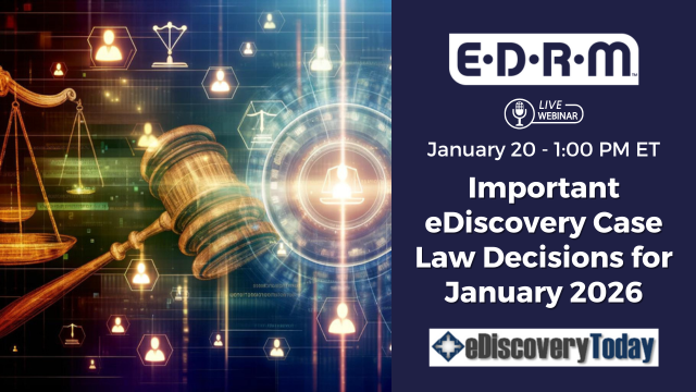 New year, new cases! In our January 2026 monthly webinar of cases covered by the eDiscovery Today blog, we will discuss disputes related to use of boilerplate objections, ineffective Technology Assisted Review process, production of AI prompts and outputs, custodians to be included in discovery, privacy rights for personal email data, and dueling ESI orders!