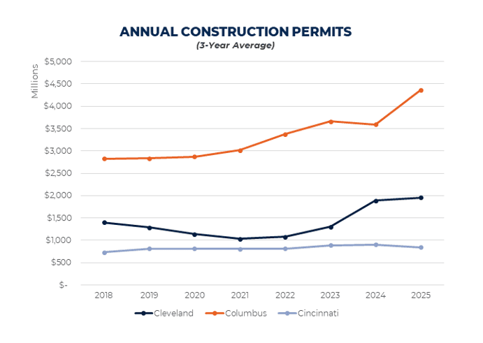 Compared to Columbus and Cincinnati, Cleveland’s construction market dipped noticeably during the pandemic. Since 2023, the market has returned to the pre-2020 level. A three-year rolling average smooths out some of the vagaries of the construction market and shows a clear trend of stabilization and growth in Cleveland.