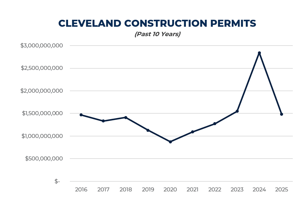 Construction permitting in Cleveland returned to trend in 2025, with nearly $1.5 billion in total permits issued. While 2024 was a banner year, with more than $2.8 billion in permits issued, it was buoyed by over $1.2 billion in permits pulled by the Cleveland Clinic’s Innovation Project, the effects of which will be felt throughout the market for year. Removing these projects leaves 2025 as slightly below 2023 and 2024, both of which saw closer to $1.6 billion in total permitting, but well in line with the trend. A deeper look into the numbers can tell us a few good things about the real estate market and a few things to be concerned about going into 2026.
