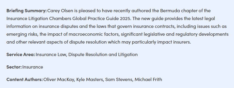 Bermuda's segregated accounts regime is another area that could create additional disputes. The BMA has recently issued a Guidance Note outlining its expectations for companies using segregated accounts to conduct regulated insurance business. This is due to become effective on 1 January 2025. Along with the Incorporated Segregated Accounts Companies Act, which was enacted in 2019, these innovative ways of conducting insurance business in Bermuda have the potential to create novel disputed issues amongst counterparties and with regulatory authorities.