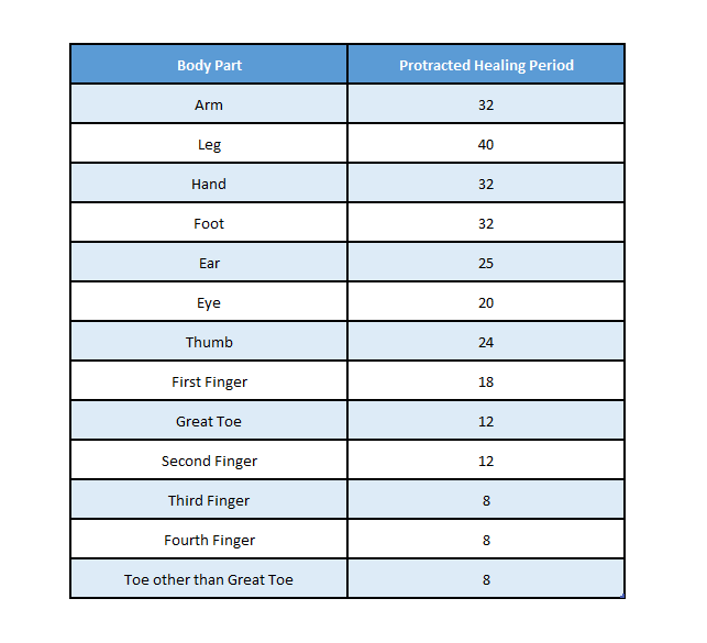 As a matter of practice, the protracted healing periods as detailed in the chart above, are always calculated based on the largest site – so a foot and a leg will be based on the leg total but will also be affected by which sites a temporary total (TT) finding is allocated to. This is particularly important in claims where claimants undergo multiple surgeries to different schedule loss of use sites. A claimant may end up with 50 weeks of total, but if those directly correspond to 25 weeks of TT for a leg surgery and 25 weeks for a shoulder surgery, neither has exceeded the protracted healing periods, and neither should result in a PHP period.