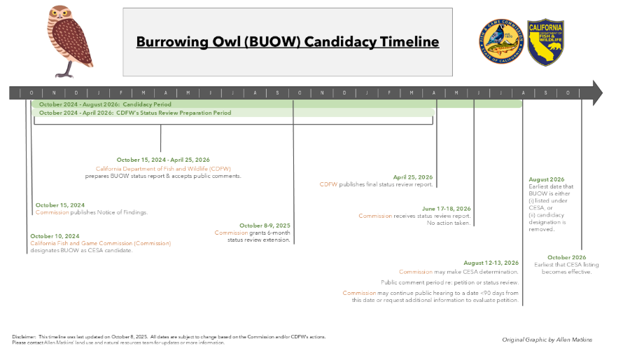 At its October 8, 2025, meeting, the California Fish and Game Commission (Commission) granted the California Department of Fish and Wildlife (CDFW) a six-month extension to complete its status review of the March 5, 2024, petition to list the western burrowing owl (BUOW) under the California Endangered Species Act (CESA). The image below details the new BUOW listing timeline.
